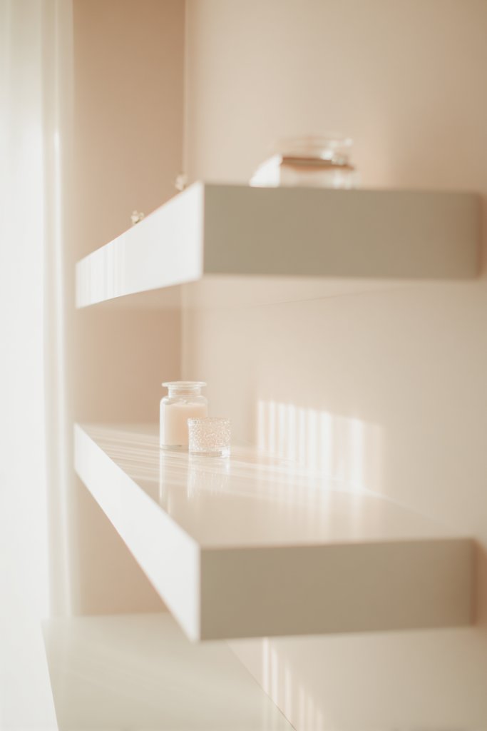 Imagine slim, matte-finished shelves mounted against a softly tinted wall, holding neatly arranged jars, brushes, and decorative accents. The open design creates a sense of airiness, while the floating aspect makes the room feel less crowded. Textured ceramics or stacked books can serve as visual anchors, adding layers of interest. The lighting casts gentle shadows, emphasizing the clean lines.