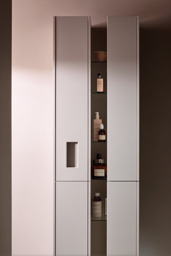 Visualize a slim, matte-finish cabinet with push-to-open doors blending seamlessly into your wall. Inside, cleverly concealed drawers and compartments hide your essentials, maintaining a clean appearance. The subtle design allows your decor to shine without distraction. A few decorative accents enhance the modern aesthetic.