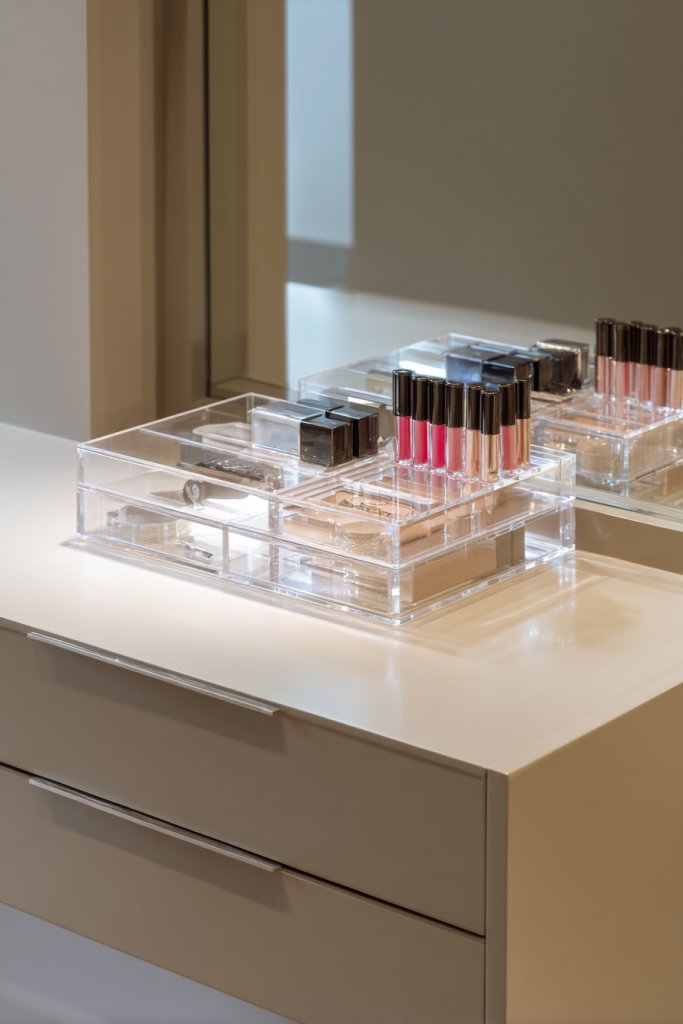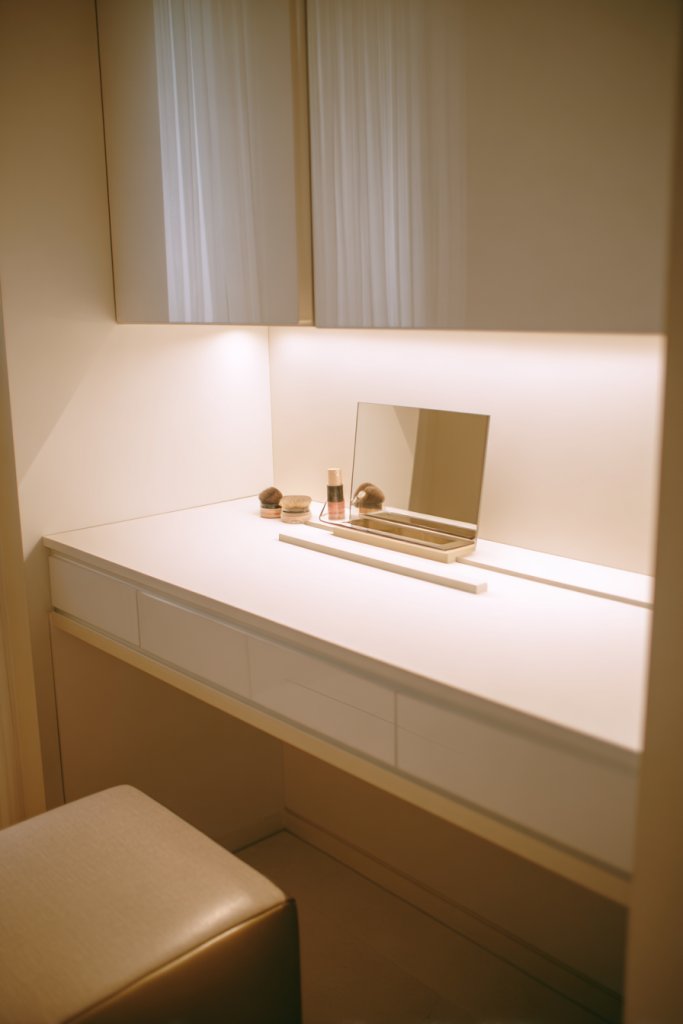 Imagine a white lacquered desk with drawers and compartments built right in, topped with a smooth surface in a neutral tone. Small, organized sections hold your brushes, skincare, and tools, all within arm’s reach. The clean lines and hidden storage keep the space looking fresh and uncluttered. Soft lighting above illuminates your face and workspace.