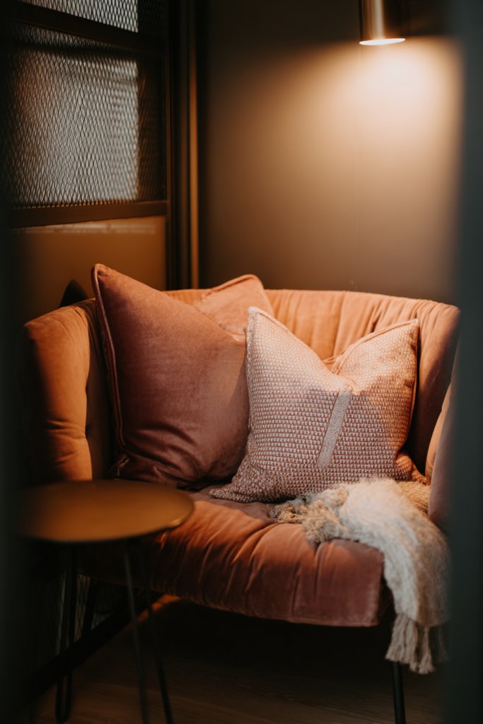 Imagine a plush armchair or window seat upholstered in soft fabric, topped with an array of textured cushions in coordinating colors. A chunky knit throw drapes casually over the side. The area is styled with a small side table and a soft rug underneath. Natural light spills in, making the space feel warm and inviting.