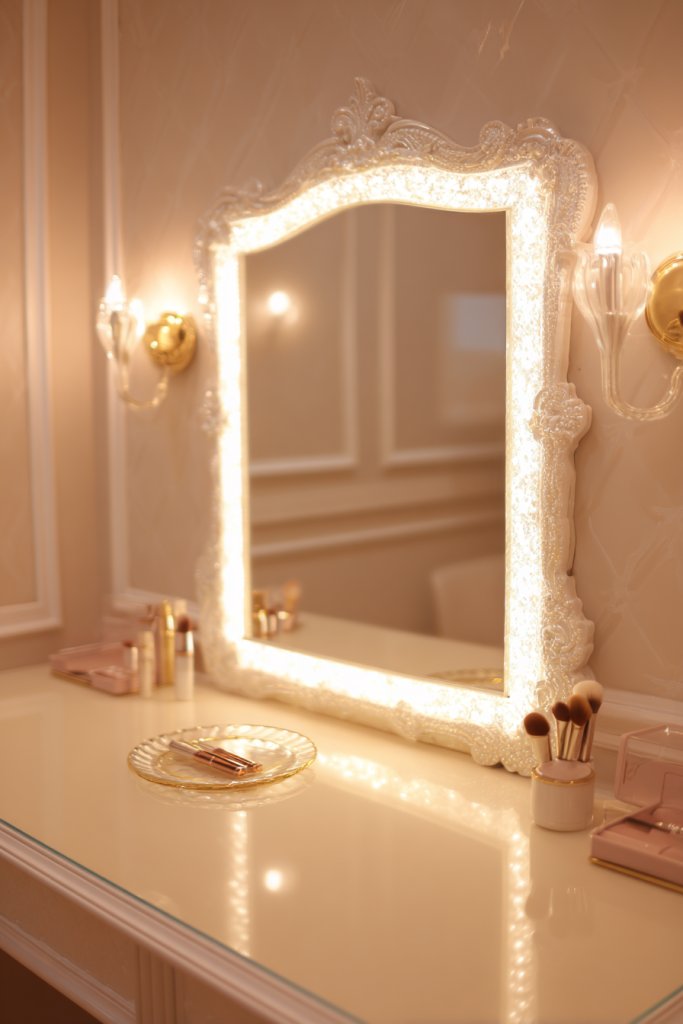 Picture a sleek, vintage-inspired vanity with a large mirror framed in metallic accents. The mirror is backlit with soft, warm LEDs that mimic natural daylight, casting a flattering glow. The tabletop is clutter-free, featuring a few elegant brushes and skincare bottles on velvet-lined trays. The ambient light softly illuminates your face, making every detail pop.