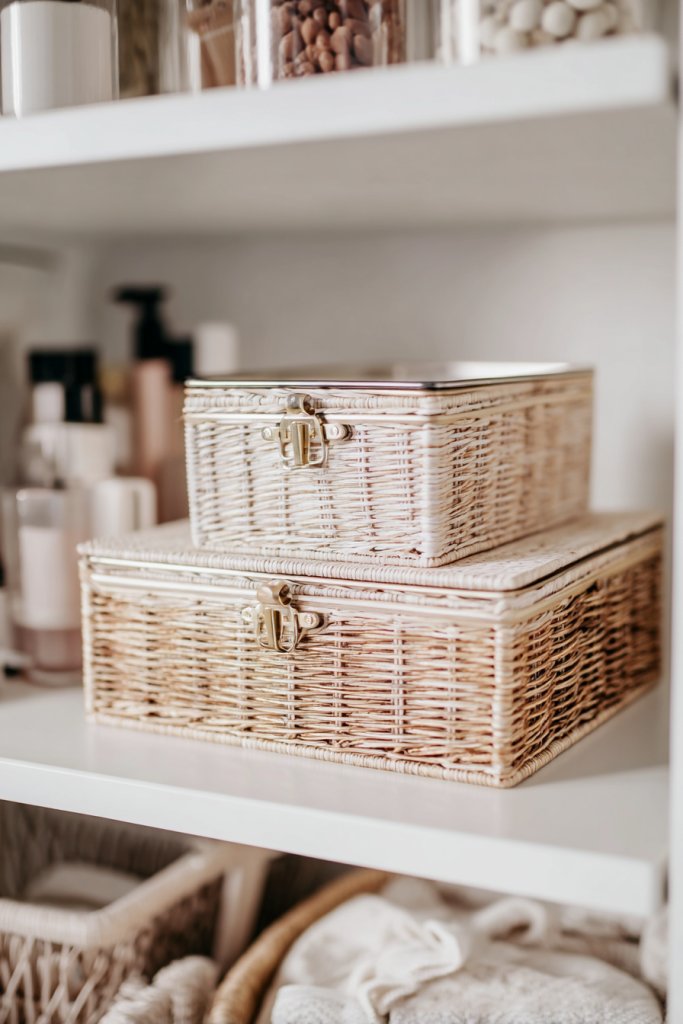 Envision woven rattan baskets, metallic tins, or acrylic bins lined up on shelves or under your vanity. The different textures and finishes add visual interest while keeping your products concealed. Labels or tags in chic fonts guide you effortlessly, and the materials catch the light beautifully. The overall look is organized and on-trend.