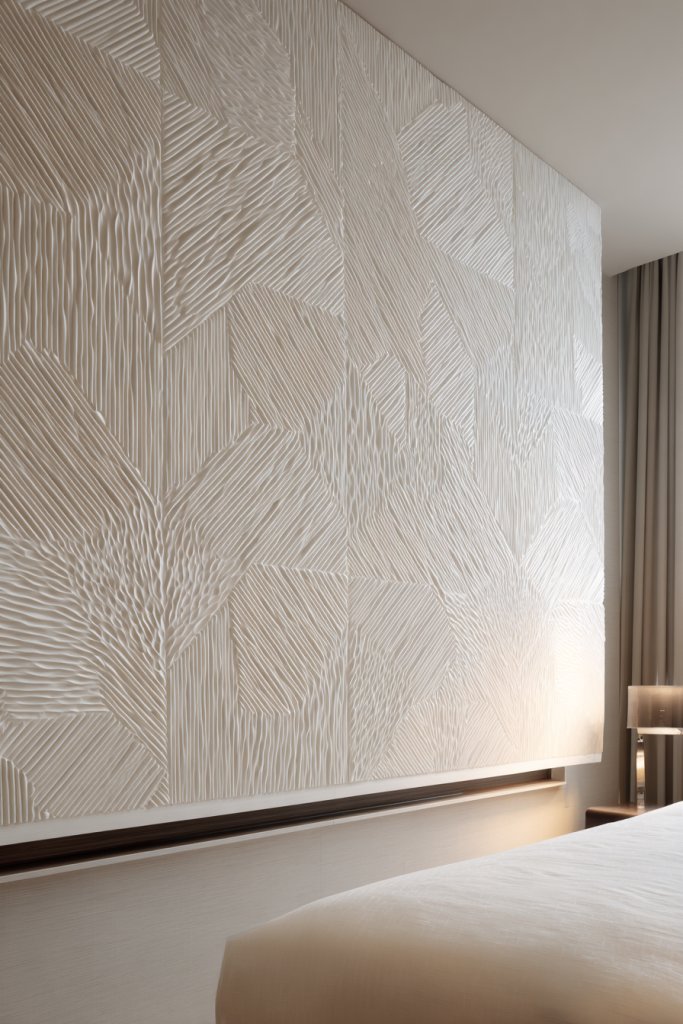 Picture neutral-toned panels with a woven or embossed texture, arranged in a geometric pattern behind your vanity or seating area. The tactile surface catches light and shadows, adding visual intrigue. They soften the space and add architectural interest without overwhelming. The textured surface invites touch and creates a layered aesthetic.