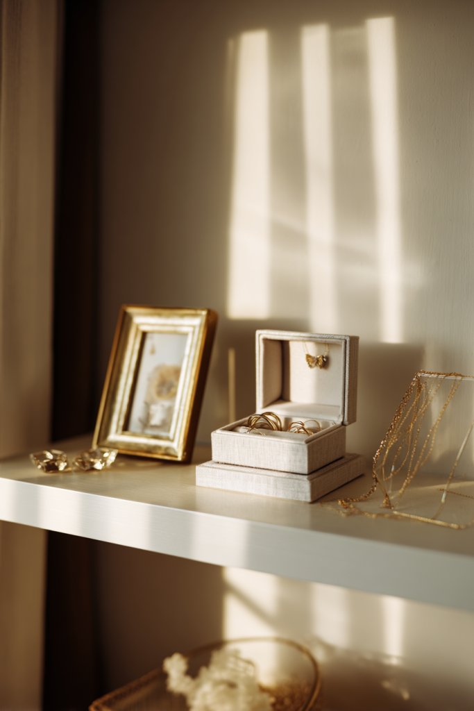 Imagine a small, elegant shelf or shadow box filled with framed photos, vintage perfume bottles, or sentimental trinkets. Arranged thoughtfully, these items create a curated gallery that invites admiration. Soft lighting or subtle backdrops enhance the display, making each piece pop. The overall vibe is personal yet polished.