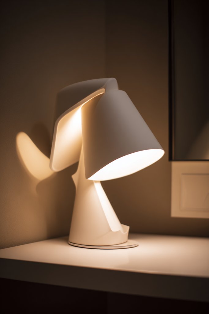 Picture a sleek, metallic lamp with an adjustable arm and a sculptural shade, placed on your vanity or desk. The light casts a focused glow, highlighting your work area and creating a dramatic, stylish effect. The design combines form and function, acting as a piece of art when not in use. It adds a contemporary vibe.