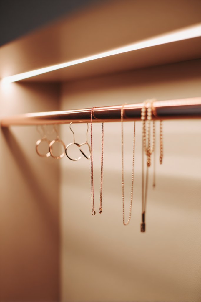 Tangled necklaces and scattered earrings can kill your vibe before you even start. An elegant jewelry display with minimalist hooks keeps everything organized and showcases your favorite pieces. It’s a simple fix that adds sophistication and saves time every morning. Who knew organization could look this good?