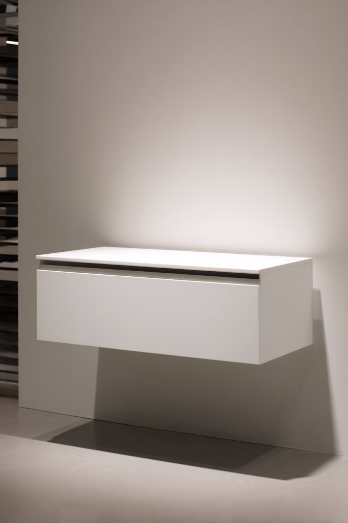 Imagine a wall-mounted panel with a smooth matte finish, seamlessly blending into your wall. A slim drawer slides out quietly, revealing space for books, chargers, or even a cozy throw. The floating design creates an illusion of more space, making your room feel airier and less cramped. Soft LED lighting underneath adds a gentle glow, emphasizing the clean lines and minimalist charm.