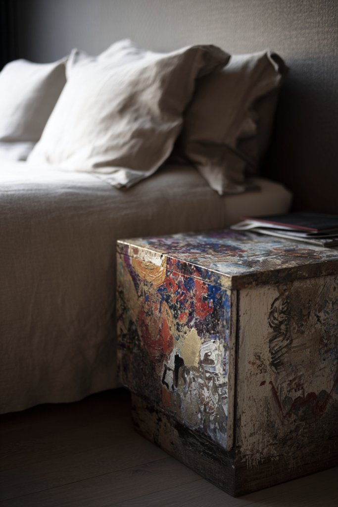 Picture a small wooden table transformed by vibrant brushstrokes or intricate patterns. Maybe a geometric design in bold colors or a delicate floral motif in soft pastels. The textured paint adds depth and dimension, inviting touch and admiration. Placed beside a neutral bedding set, it becomes a lively art piece that sparks conversation and admiration.