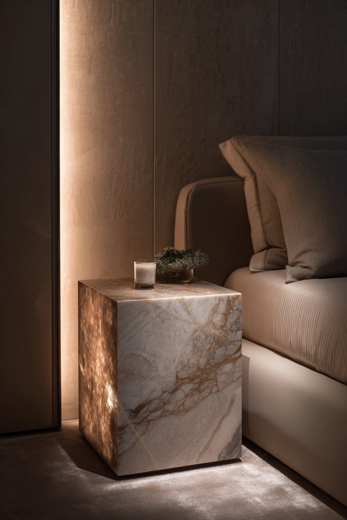 A stone or marble-topped nightstand exudes effortless elegance and durability. It’s a statement that combines nature’s beauty with modern design. Once in place, it elevates your entire bedroom aesthetic and invites admiration. Step into luxury every night—your space deserves it.