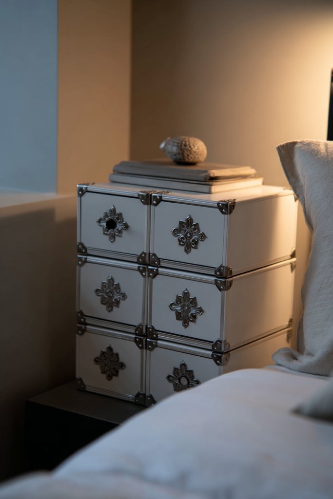 Looking for a bedside solution that adds character and extra storage? A vintage wooden chest or trunk offers both charm and practicality, turning your bedside into a statement piece. It combines nostalgic appeal with modern functionality, perfect for those who love a rustic or eclectic vibe. Plus, it keeps clutter out of sight without sacrificing style.