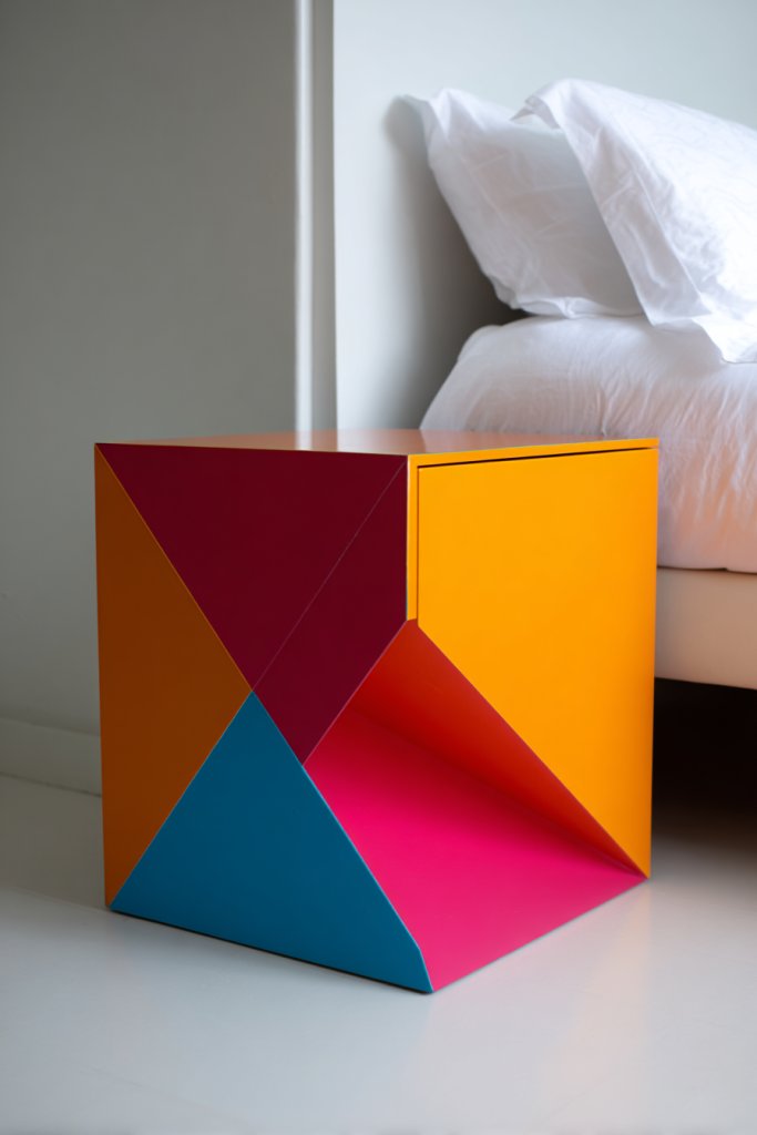 A geometric nightstand with bold colors instantly elevates your room’s vibe and shows off your personality. It’s a fun way to break the monotony of neutral decor and experiment with design. Once you see how a splash of color and a unique shape can transform your space, you’ll feel more confident in your decorating choices. This piece isn’t just furniture; it’s a mood booster and a style statement rolled into one. Ready to make your bedroom unforgettable?