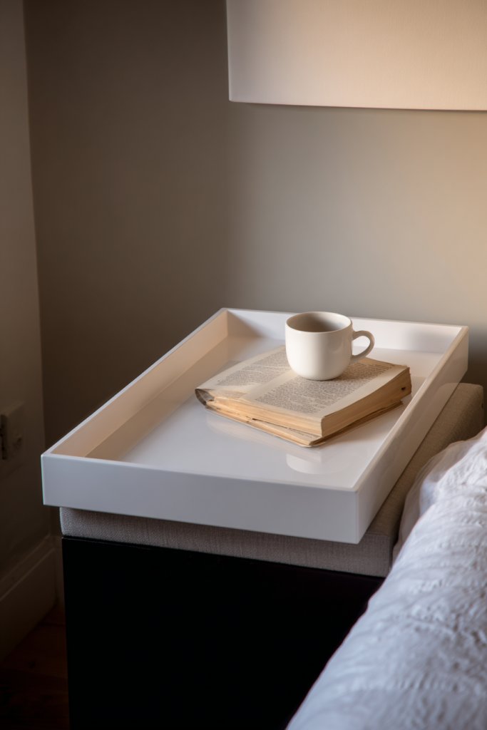 Imagine a sleek, flat tray made from rich wood or textured ceramic sitting neatly on your bedside table. It features raised edges to prevent items from slipping off and has a minimalist design that complements any decor. During the day, it serves as a catch-all for your keys or jewelry, while at night, it transforms into a cozy platform for a small diffuser or a cup of tea. The surface feels smooth under your fingertips, adding a tactile element to your space.