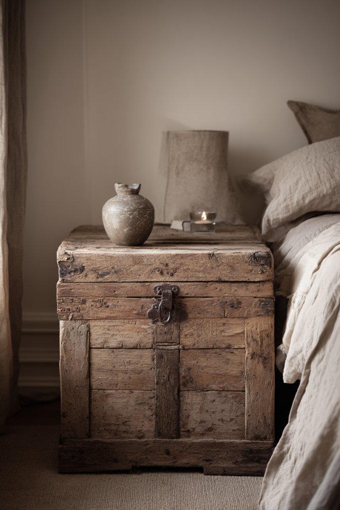 3. Vintage Wooden Chest as a Dual-Function Bedside