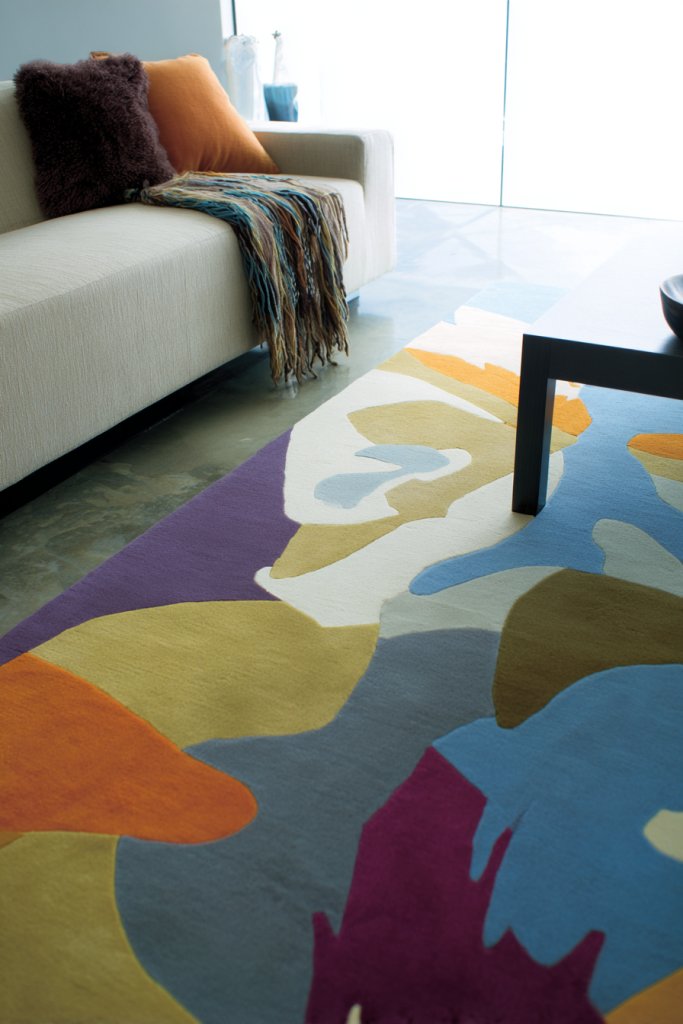 Picture a living room with a large, abstract rug featuring geometric shapes in bold hues. Layered with textured cushions and throws, the space feels lively yet sophisticated. The rug’s design echoes the artistic theme, tying together furniture and decor. Natural or artificial lighting highlights the vibrant patterns and textures, creating a dynamic environment.