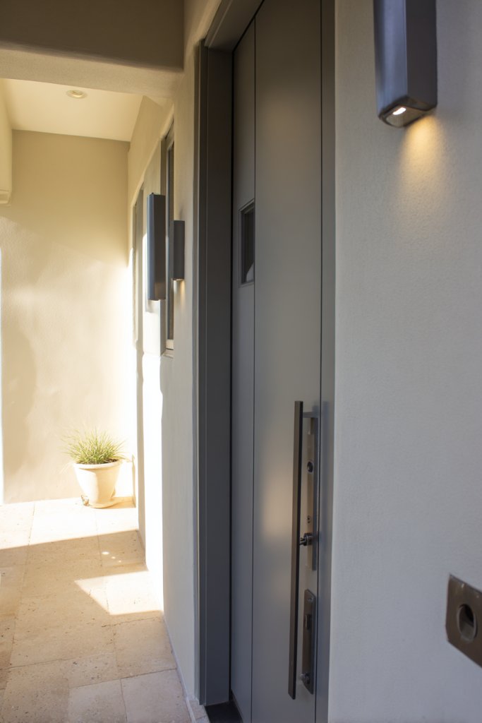 Picture a bold, minimalist front door in matte black or vibrant color, with clean lines and seamless hardware. The handle and lock are sculptural, contrasting or complementing the door finish. The entrance is framed by simple lighting fixtures or subtle architectural details. The overall effect is both modern and welcoming, making every arrival special.