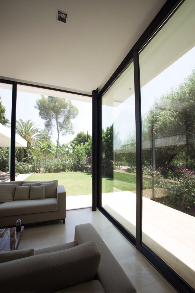 Imagine walking into a living room where glass walls stretch from the floor to the ceiling, flooding the space with sunlight. The view outside is framed like a piece of art, whether it’s a lush garden, city skyline, or mountain range. The light bounces off sleek floors and neutral walls, creating a sense of openness and freedom. Sliding glass doors can open fully, blending indoor comfort with outdoor freshness.