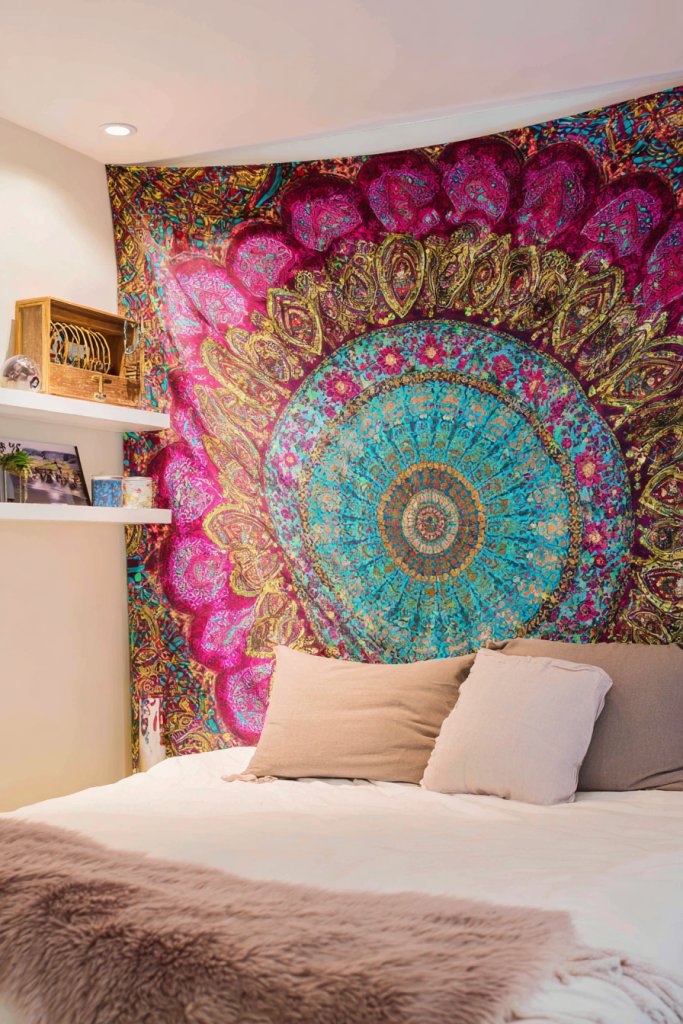 Picture a bold tapestry with floral or geometric motifs hanging behind your bed. The vibrant colors—reds, blues, yellows—bring energy into the room. Textured fabrics or woven patterns add depth, making the wall come alive. The tapestry acts as a focal point, anchoring your decor.