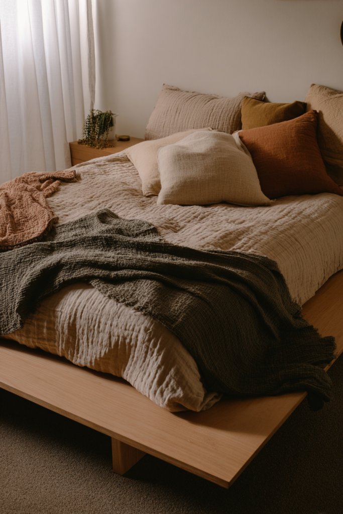 Imagine a sleek wooden or metal platform frame sitting close to the floor, topped with a mix of textured blankets, throws, and pillows in earthy tones. The layered bedding spills over the sides, creating a plush, inviting look. The simplicity of the low profile combined with soft textiles evokes calm and comfort, perfect for unwinding.