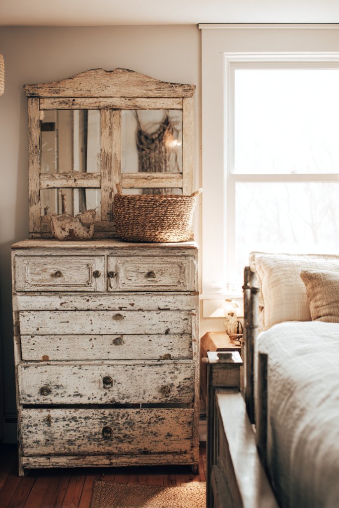 Visualize a vintage wooden dresser with distressed paint paired with a rustic metal bed frame. The textures and finishes create visual contrast—smooth vs. rough, shiny vs. matte—that add depth. Decorate with handcrafted textiles, layered rugs, and unique accessories for a layered, eclectic vibe. The space feels rich with stories.