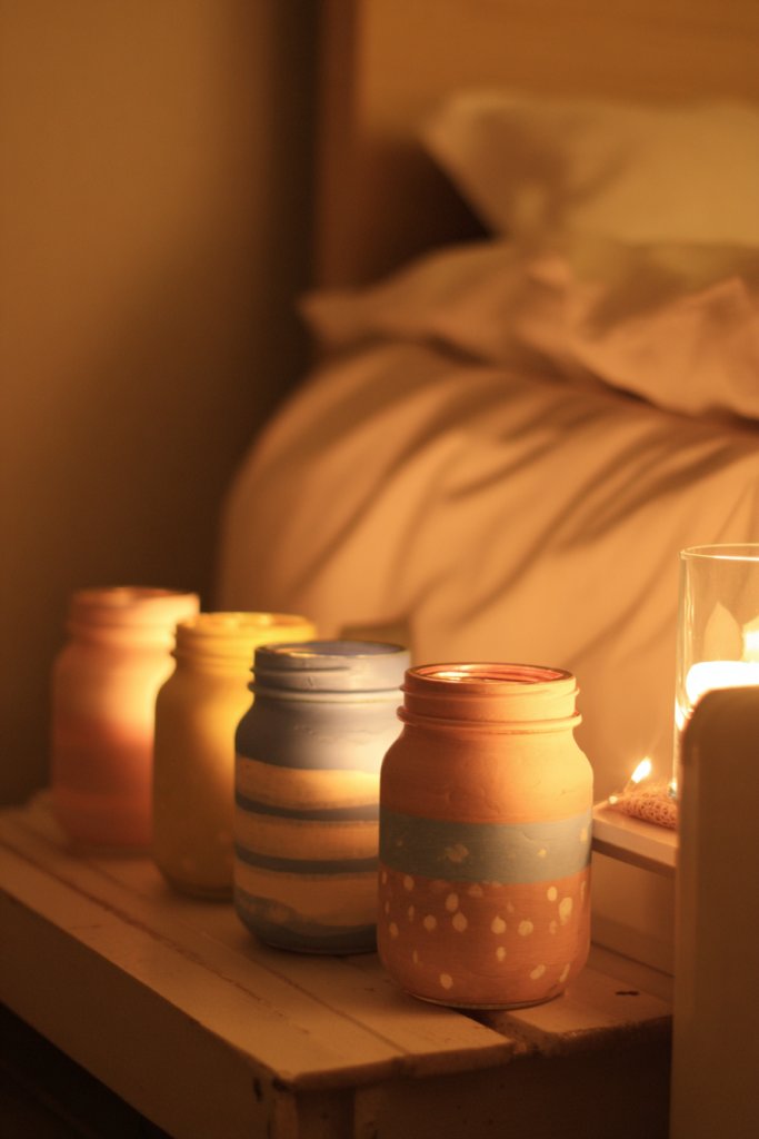 Picture jars painted with watercolor or chalk paint, with cut-out shapes or patterns that glow softly when lit. Fill them with fairy lights or battery-operated candles. Place them on shelves, bedside tables, or hang them from the ceiling for a delicate, ambient glow. The varied designs and textures add a handcrafted touch.