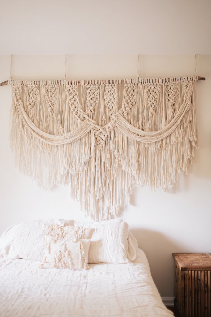 Picture a large, intricate macramé piece with knotted fringes cascading down, swaying gently as you walk by. The natural fibers create a soft, tactile visual that invites touch. Hung against a neutral wall, it provides a stunning contrast of textures—delicate yet bold. The patterns and knots draw the eye, anchoring the room’s aesthetic.