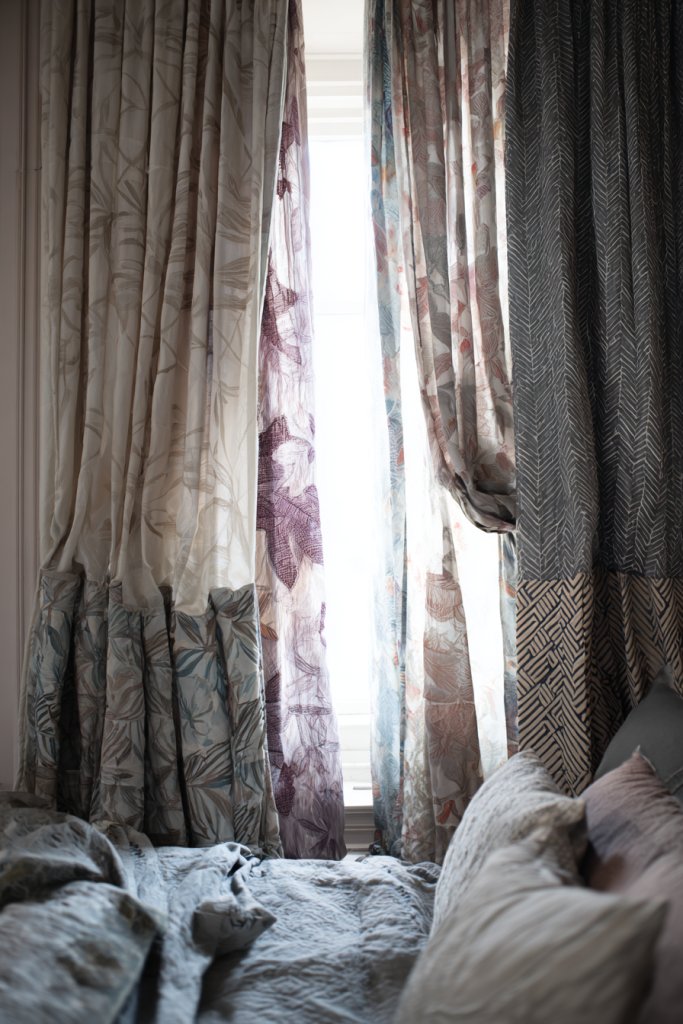Picture sheer, lightweight curtains with subtle patterns paired with heavier, patterned drapes. The sheer layers diffuse sunlight softly, while the patterned outer layer adds drama and style. When open, the fabrics cascade and create playful folds, adding movement and richness. The interplay of textures and patterns creates a layered, inviting look that’s both functional and decorative.