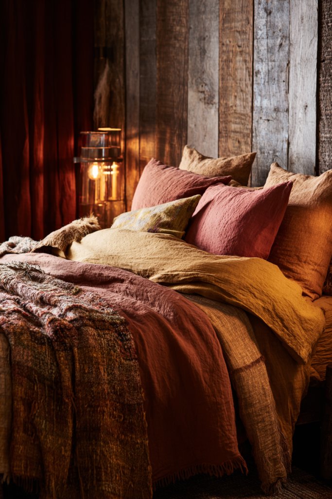 Imagine a quilted duvet with embroidered floral patterns in deep terracotta and olive green, layered with textured throws. The sheets are soft, with a subtle woven pattern that hints at craftsmanship from a bygone era. The combination of colors and textures creates a layered, rich visual that oozes warmth and personality. It’s like wrapping yourself in a story.