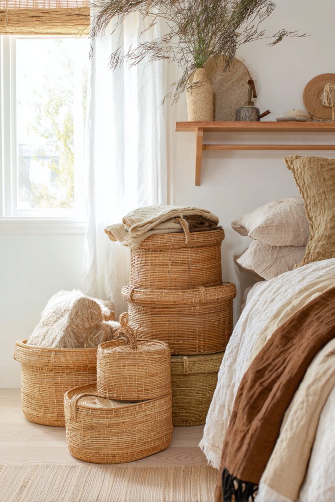 Picture large, hand-woven baskets in soft, neutral tones placed beside your bed or in a corner. They’re filled with cozy blankets or laundry, but their design keeps them looking chic. The natural fibers and intricate weaving patterns add visual interest and warmth. When stacked or grouped, they create a layered, textured look that frames your room beautifully.