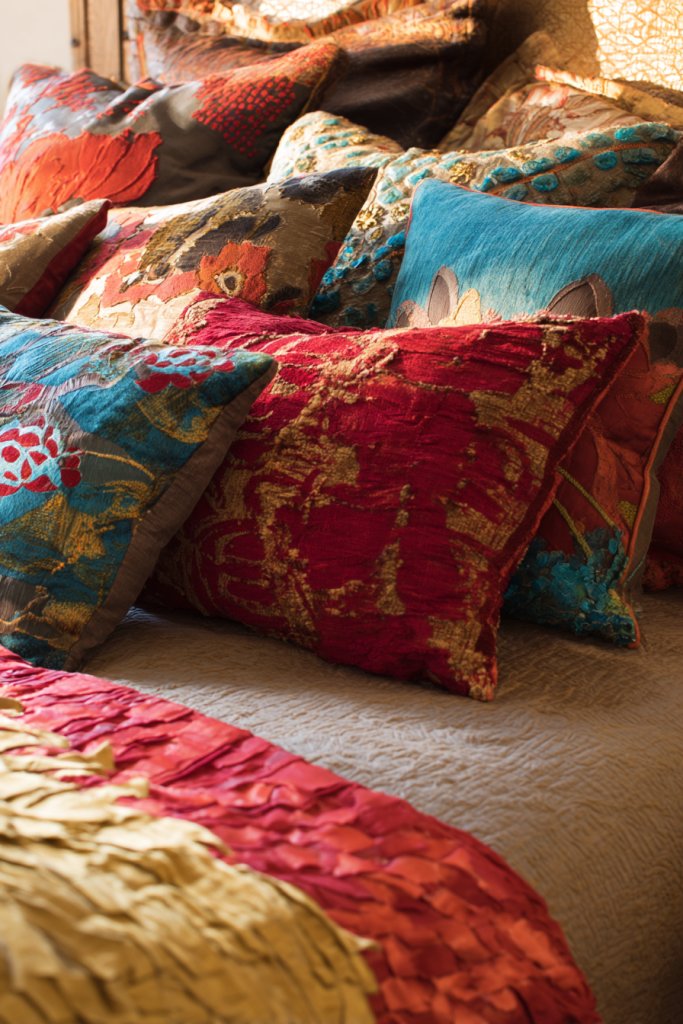 Imagine a bed layered with pillows in vibrant paisleys, tribal patterns, and ikat prints. The textures range from silky to embroidered, adding richness to your setup. The colors are rich—deep reds, turquoise, gold—that evoke a worldly, boho vibe. These pillows become the focal point, inviting you to touch and admire.
