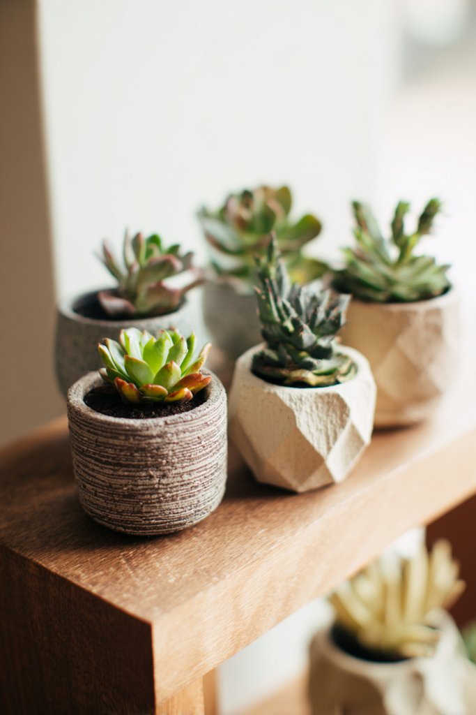 Imagine a collection of small, geometric ceramic pots filled with tiny succulents arranged on a windowsill or coffee table. The varied shapes and textures of the planters contrast beautifully with the fleshy, sculptural leaves of the succulents. Earthy tones—terracotta, matte black, or glazed whites—highlight the natural aesthetic. The overall effect is modern, fresh, and effortlessly chic.