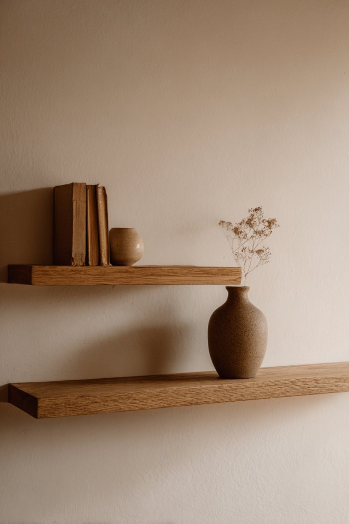 Personalize your shelves with handmade ceramics, vintage finds, or favorite books. Incorporate textiles like small woven mats or fabric-covered boxes to add softness. Add personal mementos or travel souvenirs for a meaningful touch. Play with symmetry and asymmetry to create visual interest and balance.