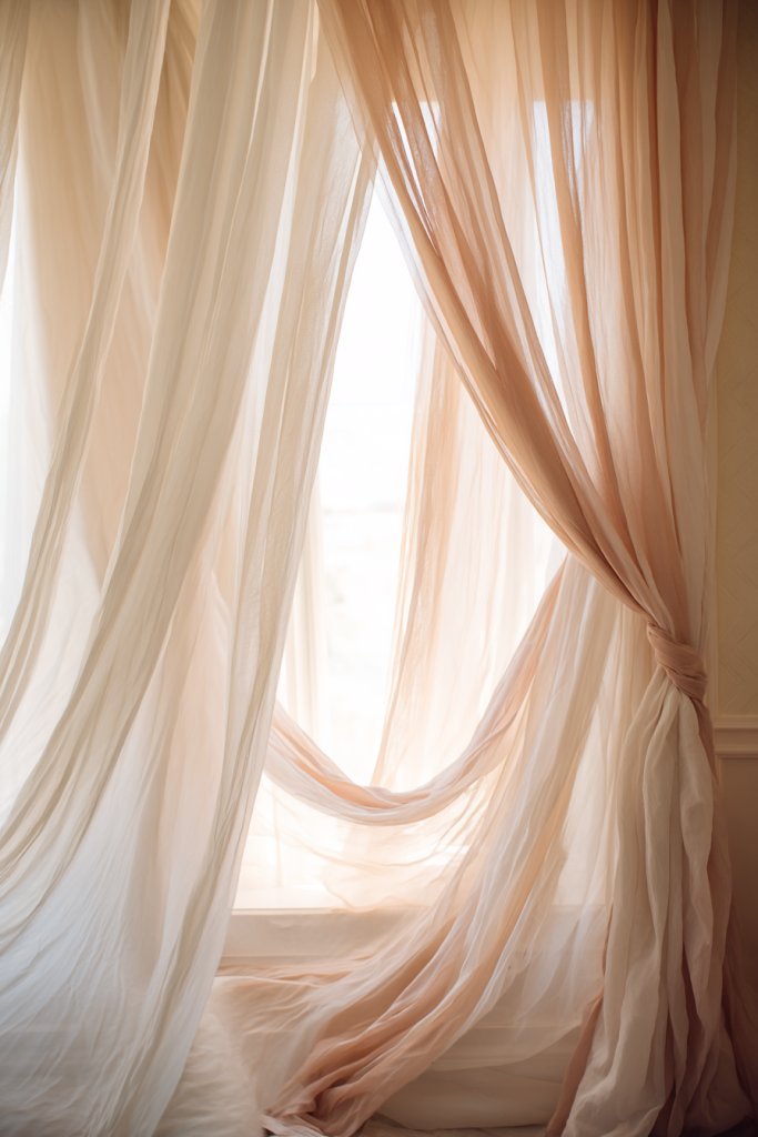 Picture sheer, billowing curtains layered with semi-transparent panels in neutral tones framing a large window. The fabrics gently ripple with the breeze, adding movement and texture. The layering creates depth and softness, transforming the window into a focal point. Light filters through the fabrics, casting a warm, diffused glow that enhances the room’s serenity.