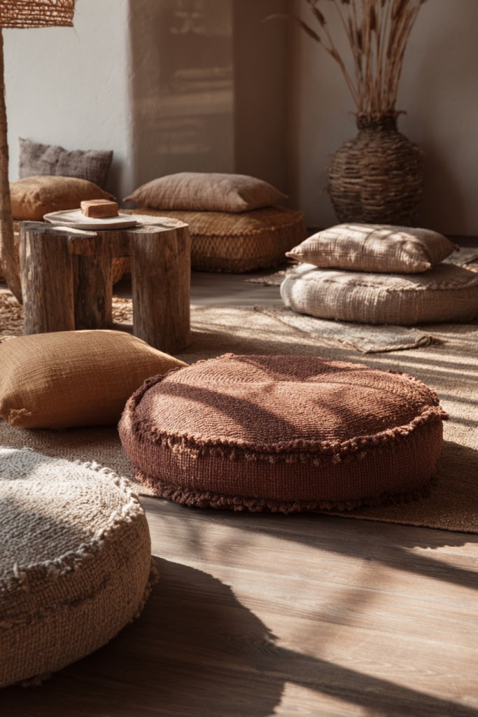 Imagine oversized, plush cushions in earthy tones scattered across a woven rug. Their textured, handwoven surfaces invite you to sink down and relax. Mix sizes and patterns—like embroidered or fringed cushions—for a cozy, eclectic look. The cushions add color and softness, transforming your floor into an inviting seating zone.