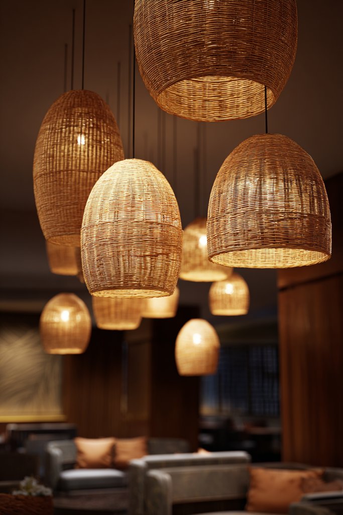 Imagine a cluster of woven pendant lights hanging at different heights over a seating area. The textured, natural fibers cast soft shadows and diffuse light warmly. Their organic shapes and warm hues blend seamlessly with textiles and wood accents, creating a cozy, inviting atmosphere. The overall effect is charming and effortlessly boho.