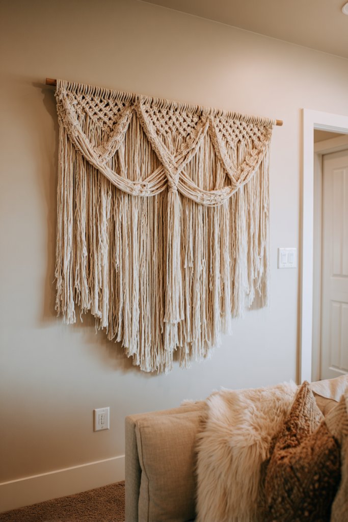 Picture a large, intricate macramé piece hanging above a low sofa, its knotted cords cascading with organic flow. The neutral-colored fibers contrast beautifully against a textured wall or painted backdrop, creating a layered visual effect. The tactile quality invites touch and adds depth to the room. The craftsmanship brings a sense of artisanal warmth and relaxed sophistication.