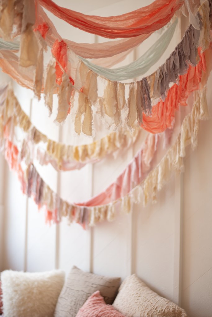 Picture delicate string garlands with tiny tassels or beads, layered across a wall or ceiling. Fabric garlands in soft, flowing textiles drape along windows or around furniture, adding softness and movement. The layered effect creates depth and makes the space feel lively and inviting. The gentle sway of fabrics and strings adds to the relaxed, boho mood.