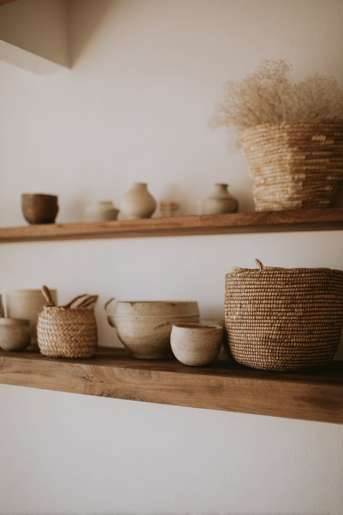 Imagine floating wooden shelves adorned with an eclectic mix of vintage ceramics, woven baskets, and artisanal objects. The layered arrangement creates a dynamic display that invites exploration. The varied textures, colors, and heights produce a curated, lived-in vibe that feels authentic and welcoming. The space immediately feels more personal and styled.