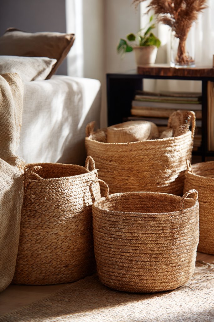 Imagine a set of round, natural-fiber baskets stacked neatly in a corner, their woven patterns catching the light beautifully. They hold everything from throws and magazines to small toys or remote controls. The varied sizes and textures create a tactile landscape that makes the space feel cozy and curated. Their earthy tones and natural fibers blend seamlessly with wood accents and soft textiles.