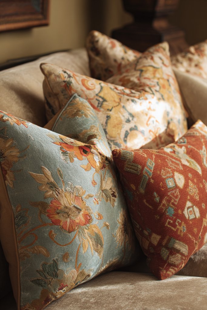 Picture a plush couch adorned with pillows in rich, warm hues—deep reds, mustard yellows, and muted terracotta. Textured fabrics like velvet, brocade, or embroidered cotton create tactile richness. Patterned covers with floral motifs, geometric shapes, or paisleys add a nostalgic, eclectic vibe. The pillows look inviting, inviting you to sink in and relax.
