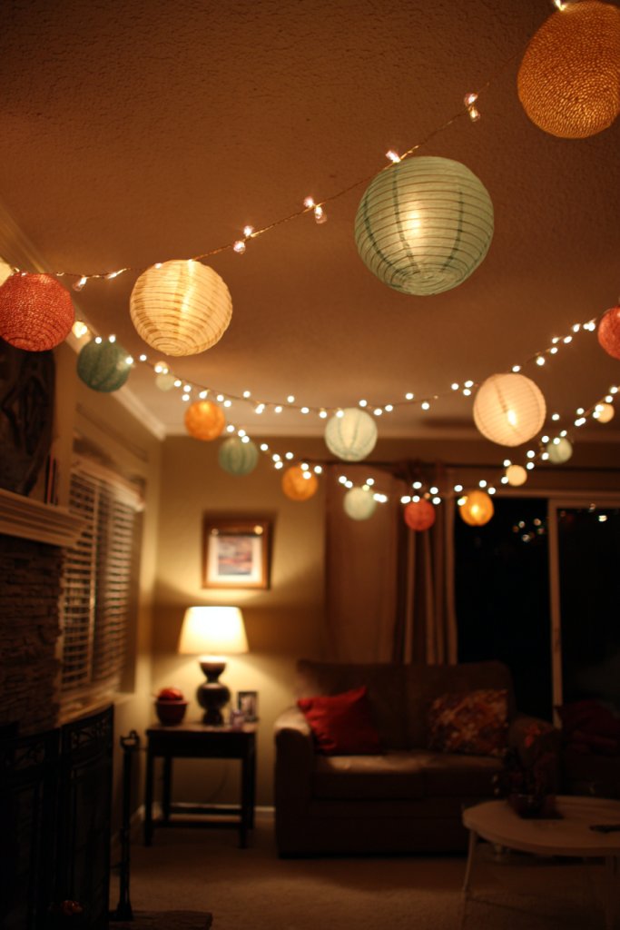 Picture a string of soft, warm lights draped along a ceiling beam, complemented by paper lanterns hanging at varying heights. The gentle glow casts a cozy light across plush cushions and textured rugs. The fabric lanterns add a touch of softness and diffuse the light, creating a dreamy atmosphere. This setup turns your room into a relaxed, festive space perfect for unwinding.