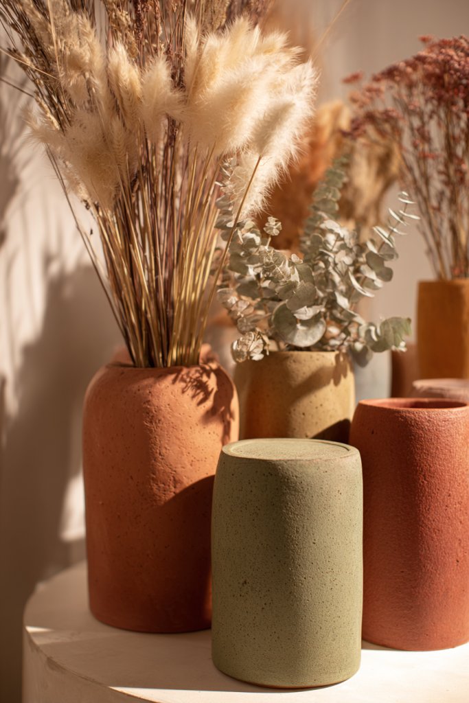 Visualize a collection of rustic ceramic vases in various shapes and earthy glazes grouped on a shelf or side table. Each vase holds a bundle of dried grasses or flowers—think pampas, lavender, or eucalyptus—adding texture and scent. The matte finishes and imperfect shapes give each piece character, making your decor feel authentic and warm. The neutral tones blend effortlessly with woven textiles and wood accents.