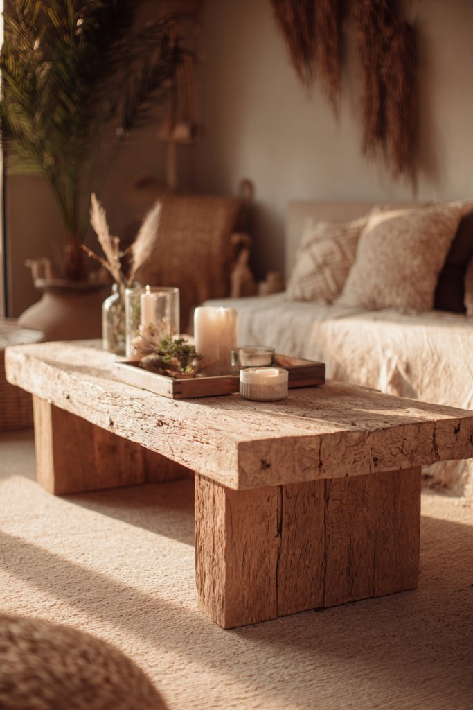 Does your living room feel cluttered or heavy? Low-profile coffee tables made from natural materials bring a relaxed, open vibe that’s perfect for boho spaces. They promote casual gatherings and make your room feel more spacious. Plus, they’re a blank canvas for styling or decorating.