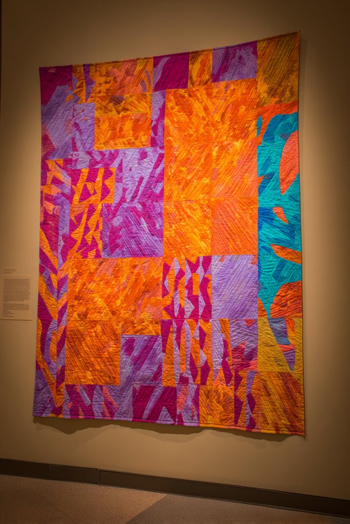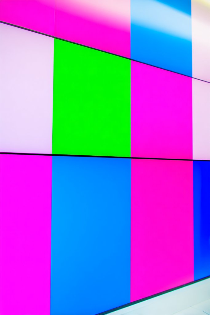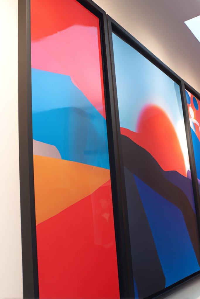 Imagine a series of large, colorful graphic panels arranged in a grid, depicting abstract shapes in electric blues, reds, and yellows. When assembled, they form a striking mural that energizes the entire room. The bold colors and shapes draw attention and set a lively tone.