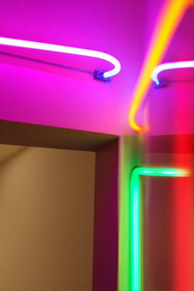 Use neon colors sparingly as accents—think small signs, LED strips, or sculptures. Combine with neutral or dark backgrounds for maximum impact. For a more subtle look, opt for soft pastel fluorescents. Mix and match different shapes and sizes for an eclectic, vibrant vibe.