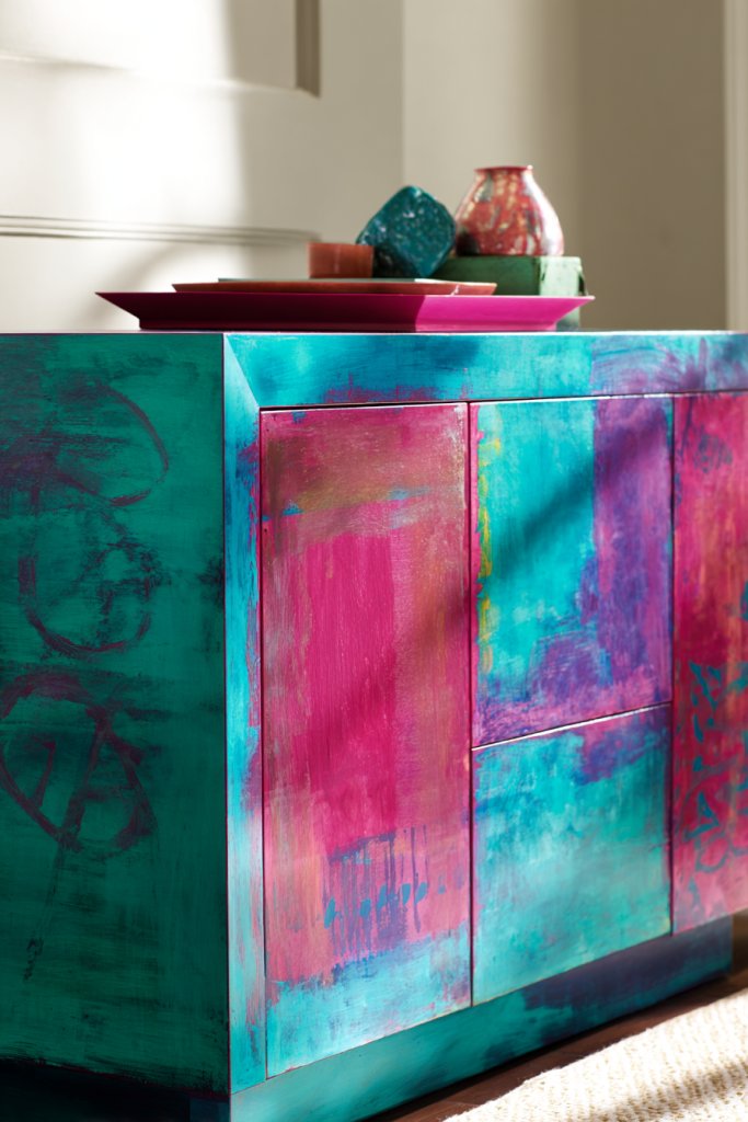 Imagine a vintage sideboard painted in a bold, matte coral with hand-painted geometric patterns. The vivid color and artistic details draw attention and serve as a visual anchor. The textured finish adds depth and character, making the piece feel one-of-a-kind.