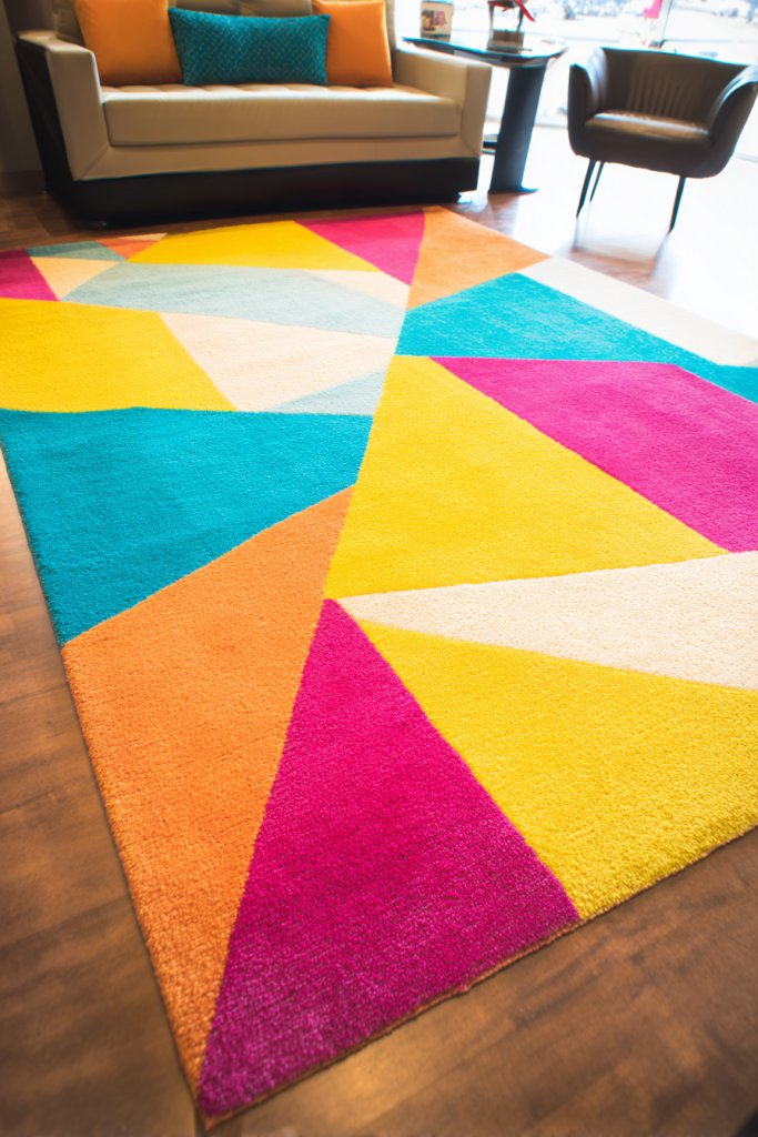 Imagine a rug with bold triangles in shades of coral, teal, and mustard spread across your floor. The sharp lines create a modern, dynamic feel, making the whole room look lively. Soft textures underfoot add comfort, while the vibrant colors energize your space. It’s like a piece of art under your feet.
