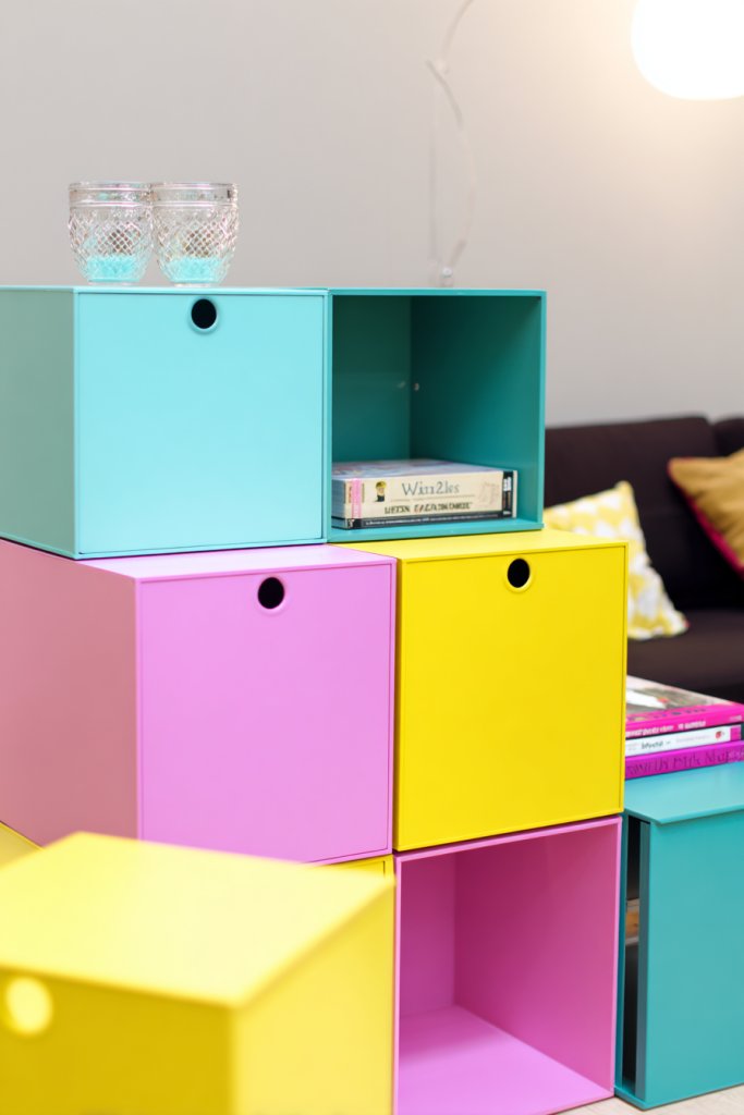 Picture a set of cubed storage in vivid pink, blue, and yellow stacked neatly against a wall. Fill some compartments with colorful baskets or boxes, others with decorative objects. The playful arrangement is both functional and visually captivating, transforming plain walls into vibrant focal points.