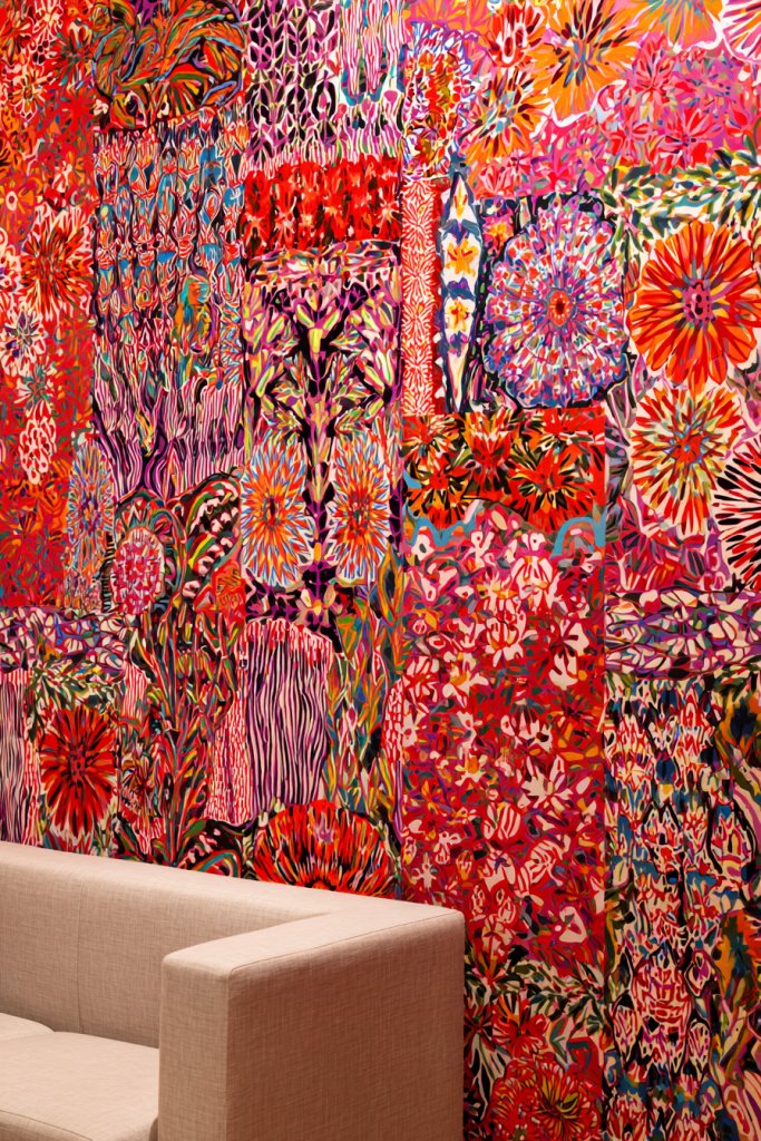 Imagine a wall covered with a vibrant, abstract pattern in shades of pink, orange, and purple. The lively design draws the eye and sets a playful tone. Paired with neutral furnishings, it creates a perfect backdrop for your decor. It’s like turning your wall into a piece of art.