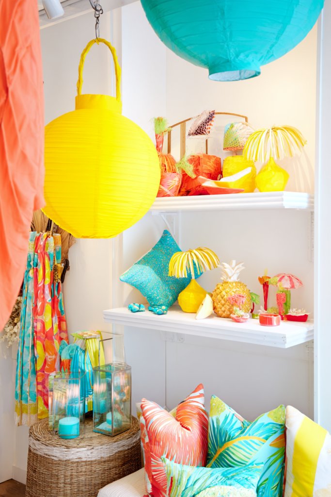 Use vibrant cushions, throws, or wall accents with tropical patterns. Add faux plants or floral arrangements to enhance the theme (without green plants, remember). Incorporate outdoor-inspired accessories like seashells or driftwood for a natural touch. Adjust the intensity of colors based on your space.