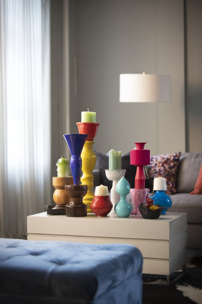 Picture a collection of vibrant glass vases, bowls, and sculptures in shades of turquoise, amber, and ruby arranged on a coffee table. Their glossy surfaces reflect light and add depth. These pops of color create focal points and brighten the overall atmosphere.